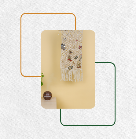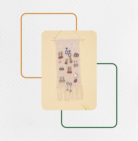 Macrame handmade earring holder is a sleek yet strong utility item for women. Knotted with cords having a seamless pattern and intricately designed, it serves the purpose of hanging earrings, to be seen at one glance. It is safe, flexible and easy to handle the suspension and removal of the earrings, an Ideal gift for women, as it encourages eco-friendly and sustainable living. Made with natural cotton cords it can be washed and reused.